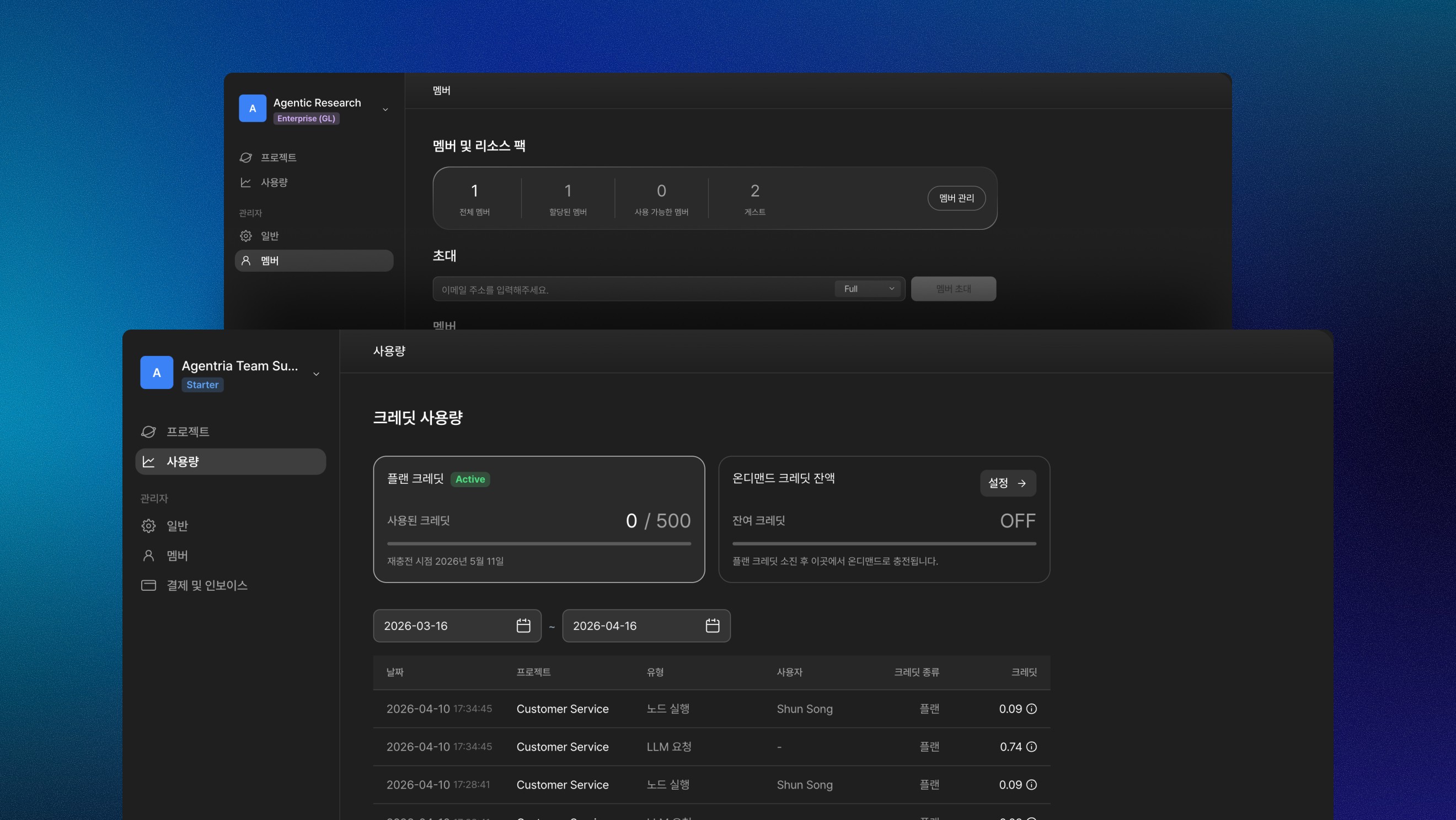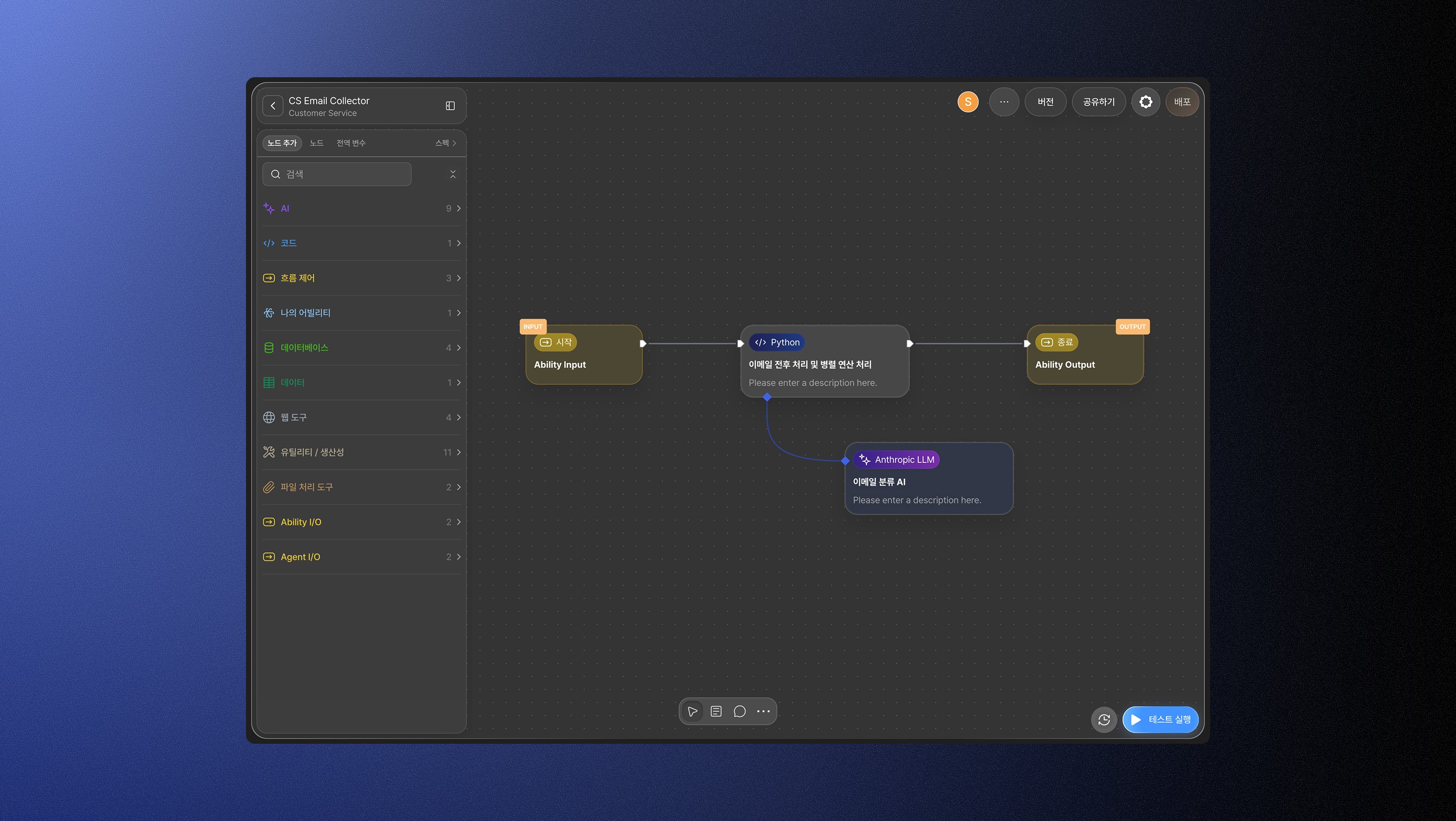 에이전트리아는 실행을 한 번으로 끝내지 않습니다. 모든 작업은 기록되고, 다시 실행할 수 있으며, 수정한 내용은 바로 반영됩니다.