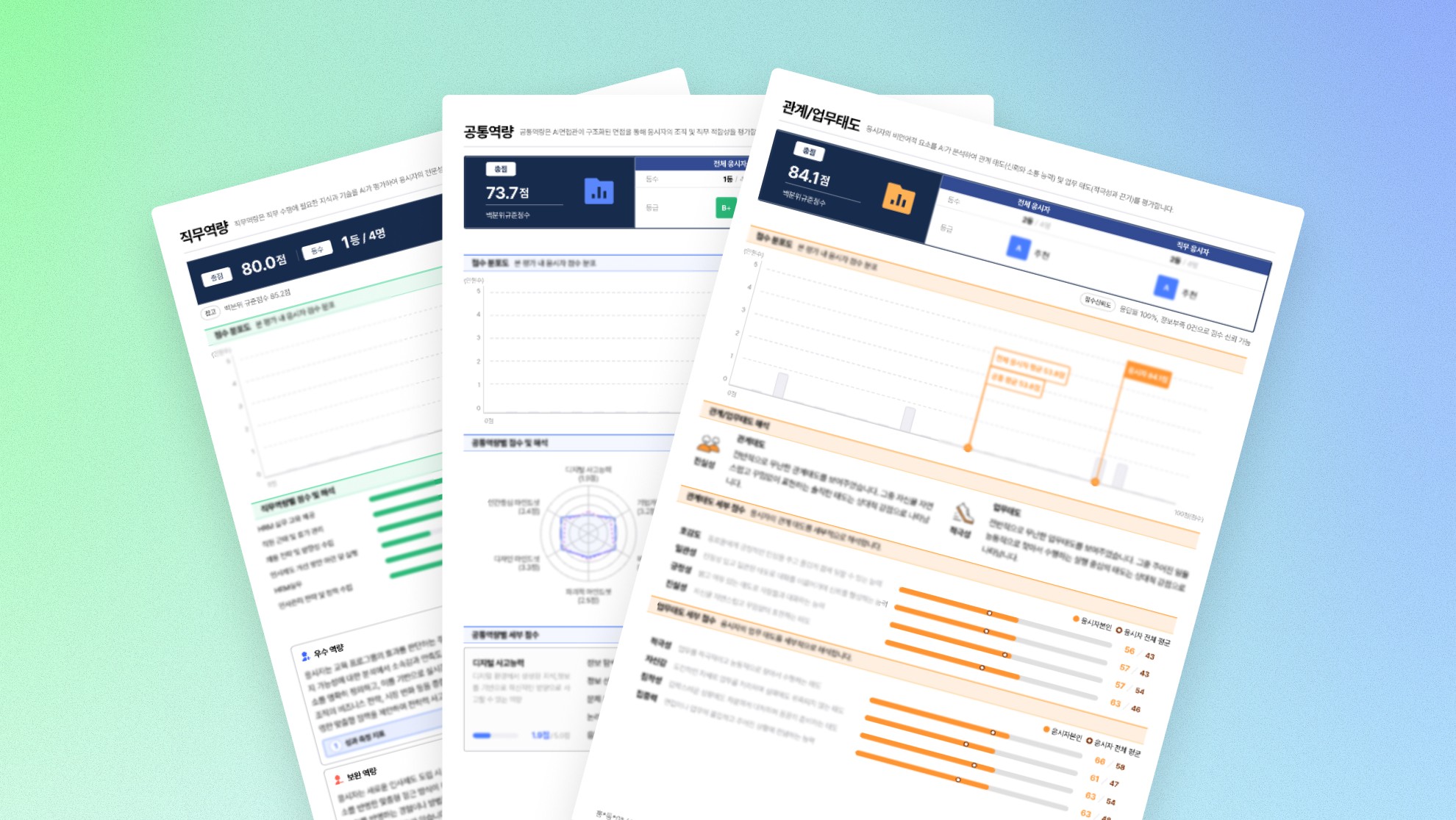 면접 중 수집되는 음성, 응답 내용, 표정·행동 같은 비언어 정보를 종합해 분석합니다. 단편적인 인상이 아니라 면접 전반의 흐름을 구조적으로 정리해 평가에 활용합니다.